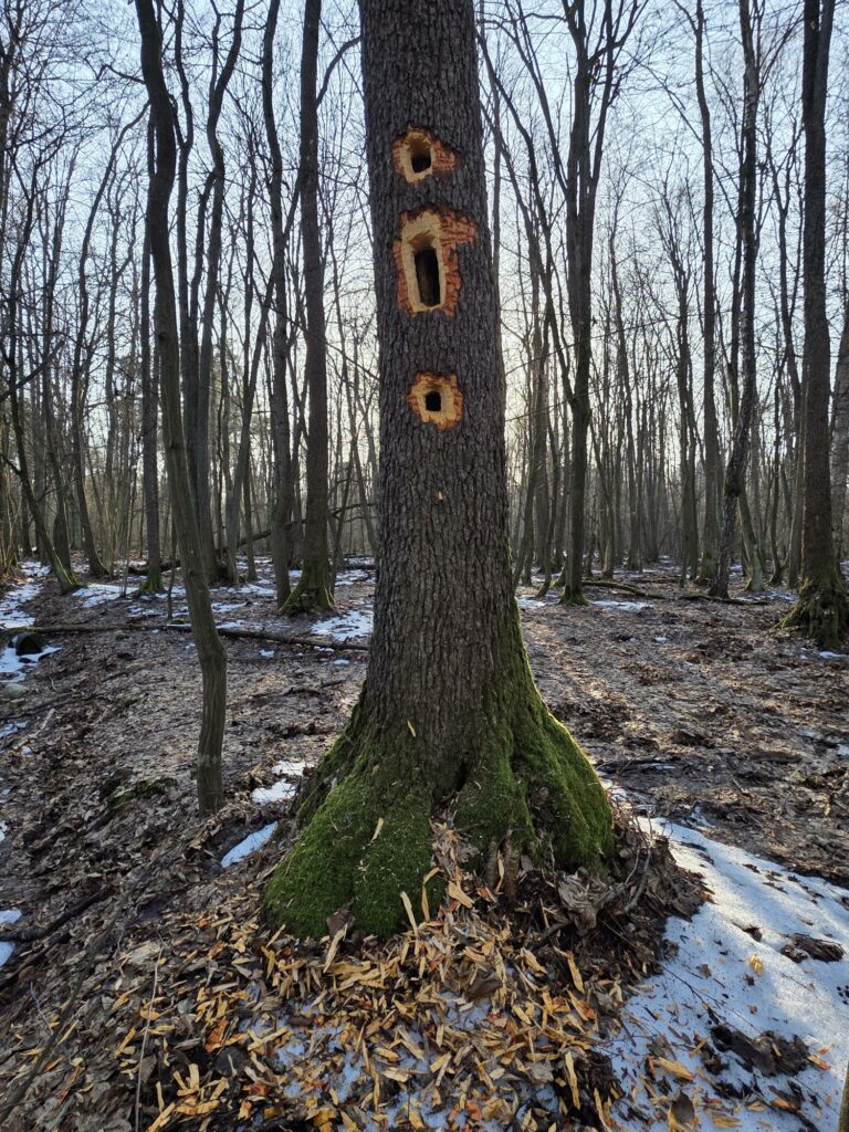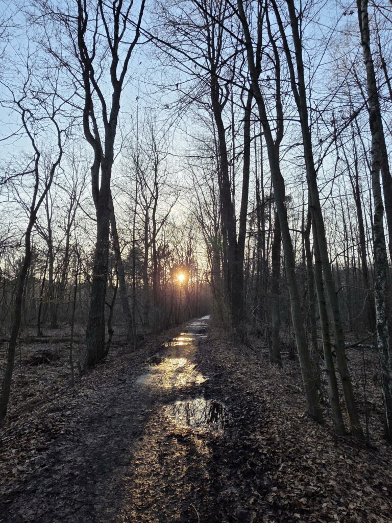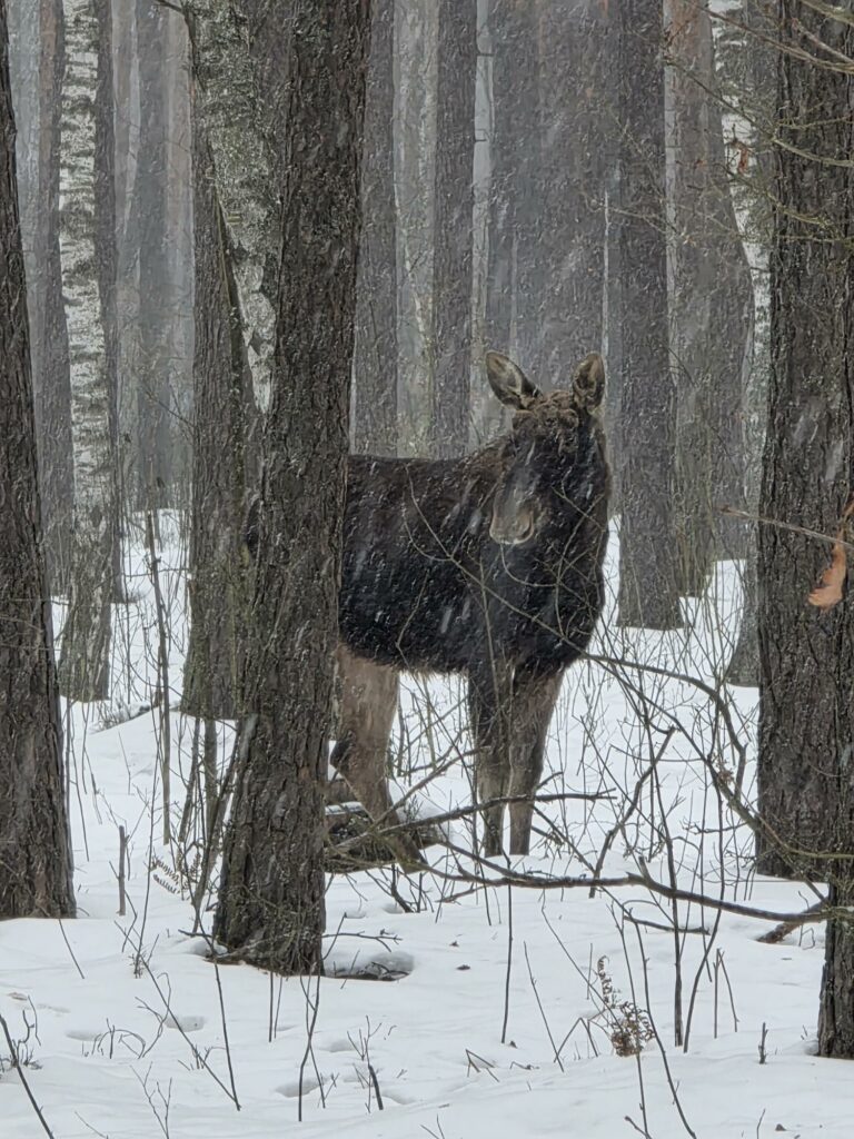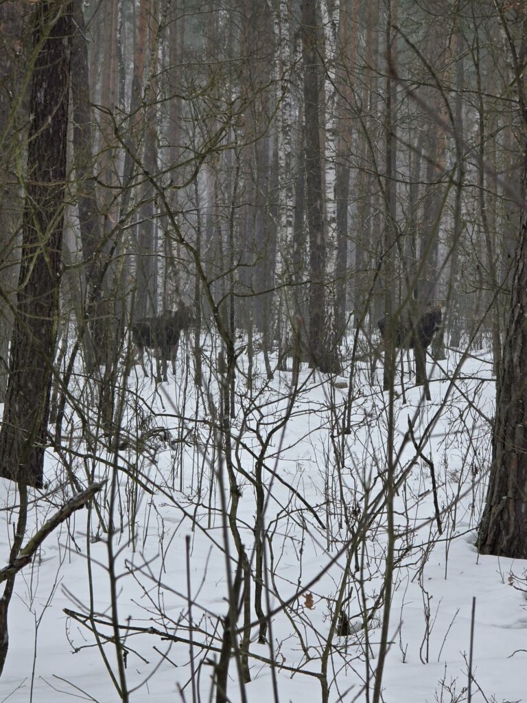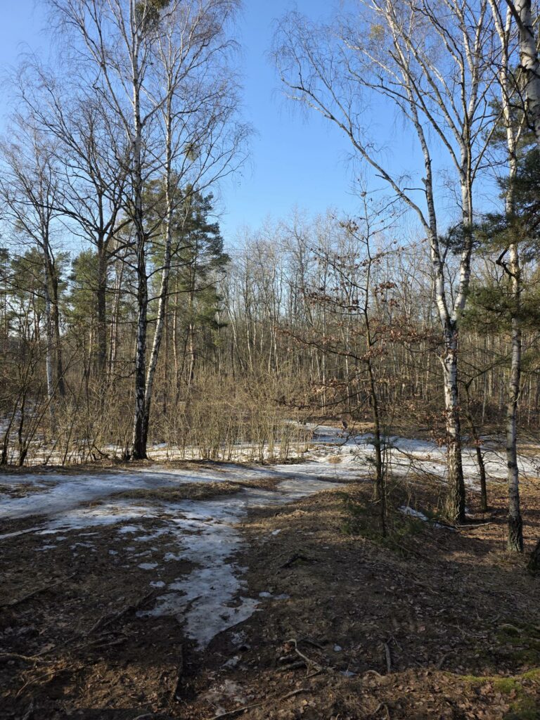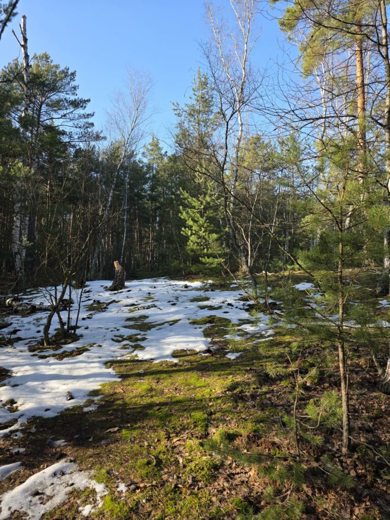 W Puszczy Kampinoskiej powoli znika śnieg, choć na ścieżkach jeszcze utrzymuje się lód pokryty wodą. Słychać już pierwsze koncerty kosów. Łosie przy czerwonym szlaku żerowały w ostatnich dniach zimy. Kiedy śnieg prawie całkowicie roztopił się, zniknęły tropy łosi, dzików, saren i jeleni, które spotykałam. Nadal jednak widoczne są liczne odchody tych zwierząt. Zadziwia fakt, że po tak śnieżnej i mroźnej zimie nie ma wody w olsie. Roztopy zniknęły. Czyżby ziemia była aż tak spragniona wody? Już miałam nadzieję, że w tym roku knieć błotna zwana kaczeńcem będzie kwitnąć na tle uwodnilnego olsu. Tak się jednak nie stanie, chyba, że wiosna będzie deszczowa.